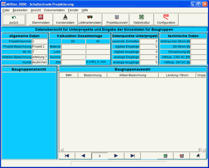 Anlagenkonfiguration Softwareprojektierung der einzelnen SchrankfelderMithilfe des Programmteiles "Konfiguration" (Bild 1) können sie ihre Verteilung, entsprechend ihrer Motoren- und Energieverbraucherliste im Teilfenster "Baugruppenauswahl", bestücken. Die durch den Anwender festgelegten Projektdaten werden aus der "Projektverwaltung" und "Netzstruktur" in das Fenster "allgemeine Daten" übernommen. Die Datenpunkte und die technischen Daten werden durch das Softwaretool "MOStec2000