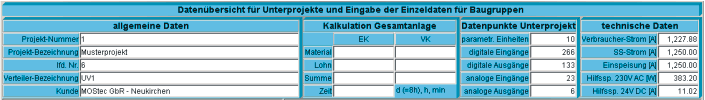 Im Teilfenster "Technische Daten" wird der errechnete Verbraucher- und Sammelschienenstrom, die Einspeisung und der durch das Programm ermittelte Steuerspannungsbedarf (AC/DC) angezeigt.