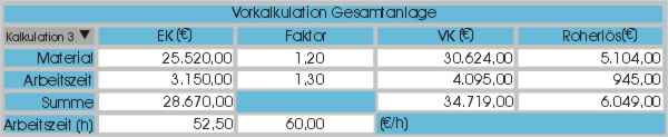 Bild 2: Fenster Kalkulation Gesamtprojekt