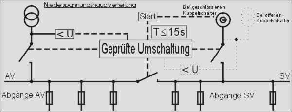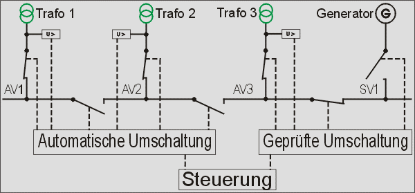 - Beide Fahrweisen bedingen eine Umschalteinrichtung, die mit Hilfe von Unterspannungsrelais in den jeweiligen Einspeisungen und über eine Steuerung (sollte TÜV geprüft sein) geschalten werden.